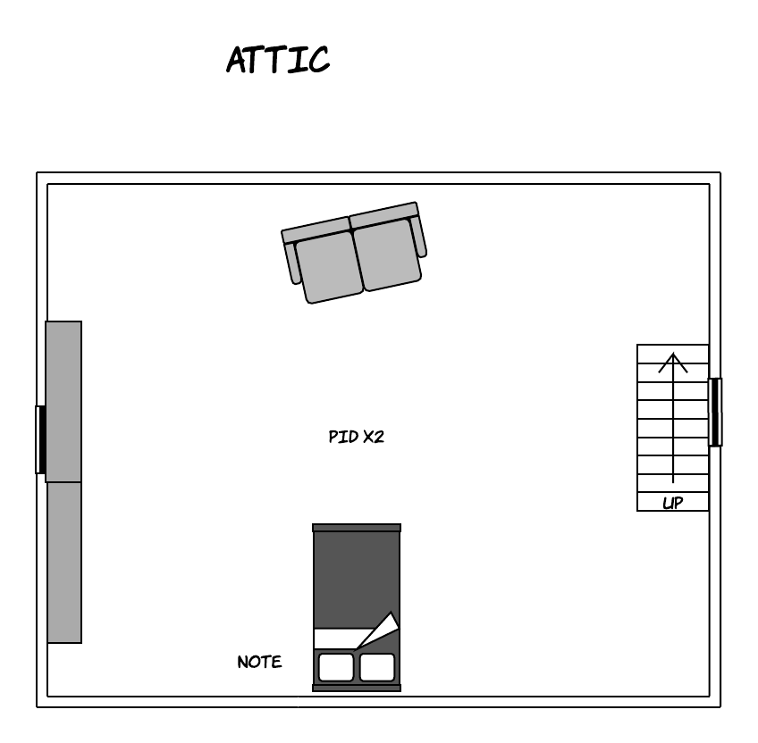 Inside the last room on the right side of the hallway, there is a door to a narrow staircase leading into a fairly large attic. The attic contains a bed and couch, a ritual blood pentagram, several shelves on the back wall, and other varying objects (crates, trash, candles, etc.).