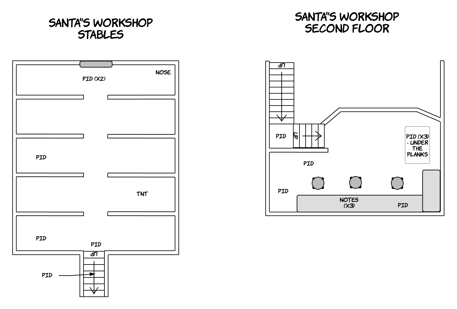 Various notes and letters addressed to Santa can be found in the workshop and office. Collectively, they imply that prior to the player's role in Santa's Rampage, Santa Claus had been under large amounts of stress from unpaid bills, outrageous requests from children, elf union strikes, a note from his brother Krampus asking for bail money, and even threats. Santa subsequently snapped under the pressure, purchasing several crates of 12-gauge shotgun rounds, steak knives, and dynamite sticks, and fashioning several makeshift molotov cocktails (likely under the influence of alcohol). Santa then went on a murder spree, mutilating several elves and reindeer, and destroyed parts of his workshop in the process. He left the scene through unknown means.