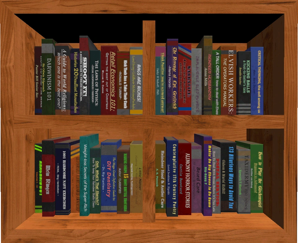 The bookshelves in Santa's Rampage contain a variety of humorous titles, which further outline Santa's descent into madness.