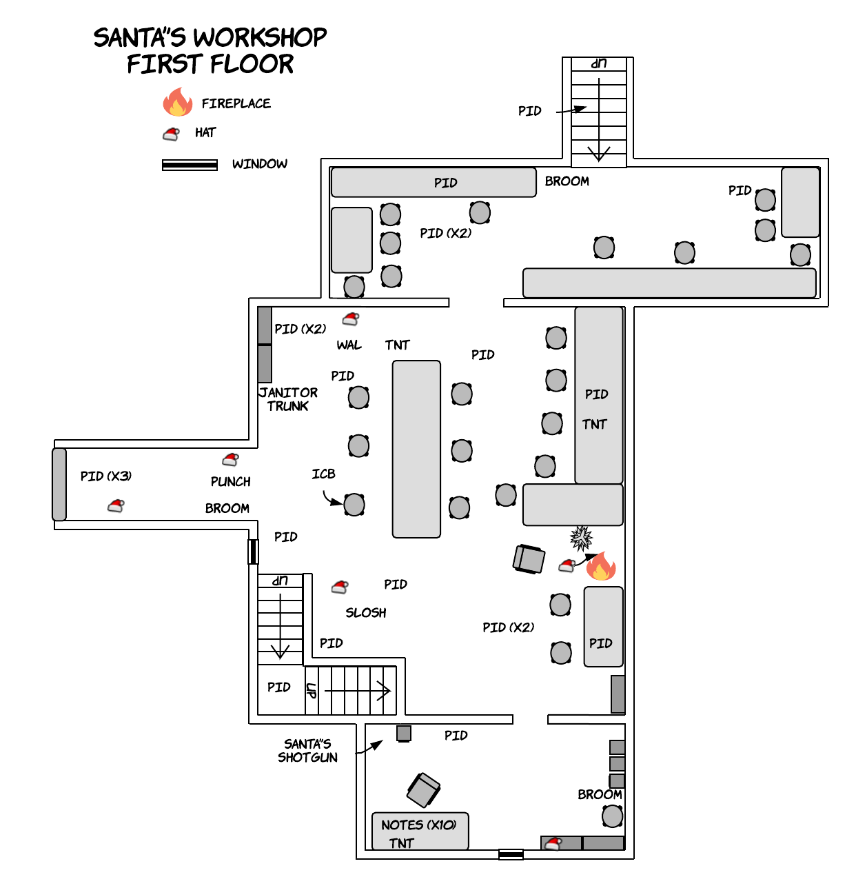 The tragic events that unfolded at this workshop must in no way deter you from performing your duties in a manner befitting the company's reputation. Your work here entails cleaning up the horrific aftermath of Mr Claus' unfortunate breakdown. This includes the obvious slaughter and any broken items and so forth.