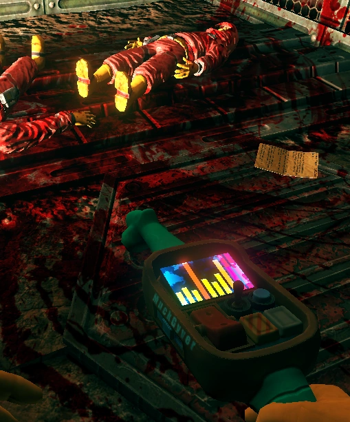 The Sniffer (or MuckGyver, as can be read on the side of the device) is one of the three primary cleaning tools in Viscera Cleanup Detail. The Sniffer is a special waste detection device used to 'sniff out' elusive waste items and "splats". It is accessed by pressing the "3" key on the keyboard or Dpad right on a controller by default, however, this can be changed in the options menu.